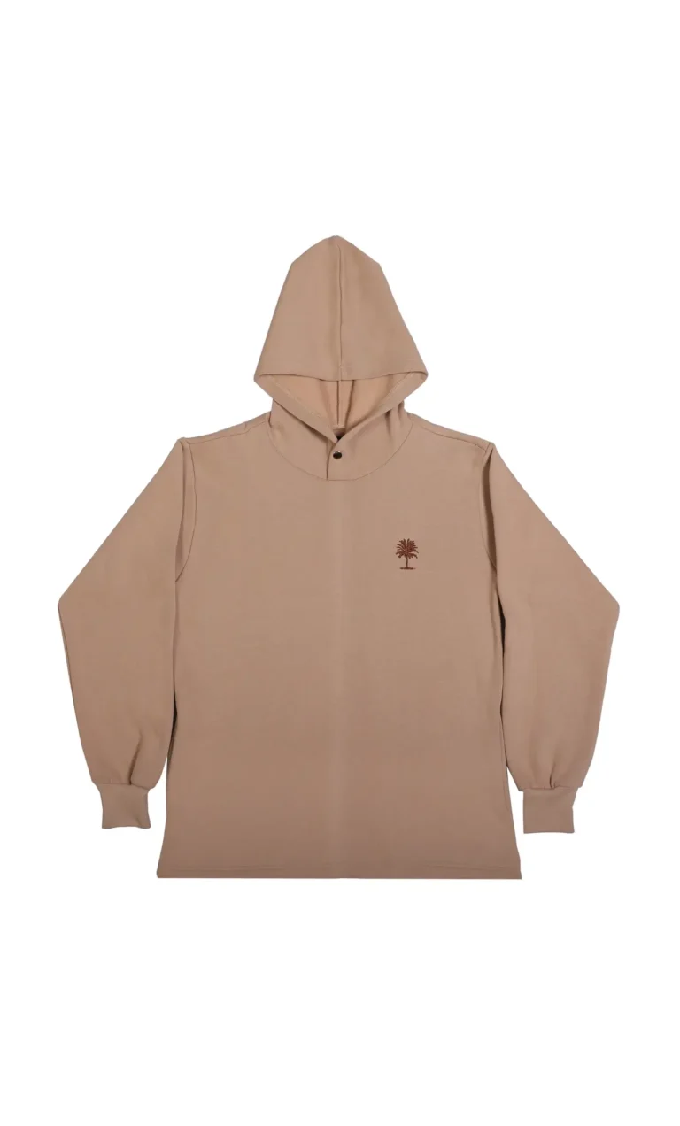 A tribute to untamed landscapes and cultural contrast, this hoodie blends mountain and palm tree embroidery in a visual narrative of رحال’s journey — where desert winds meet tropical vibes. Featuring hidden pockets on both sides, you can store your essentials discreetly without compromising on style. The unique button detailing adds a subtle yet sleek touch, while the open, loose ends provide a relaxed and modern fit that moves with you.
